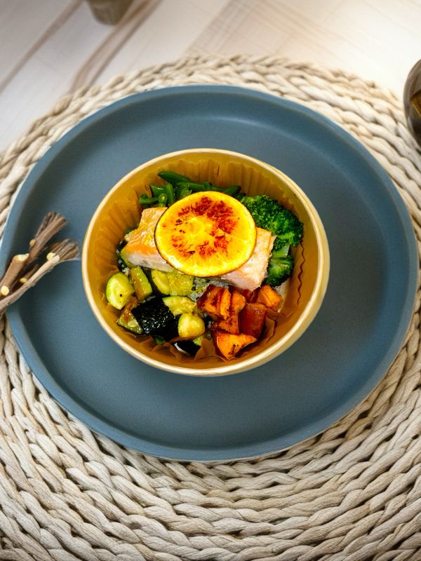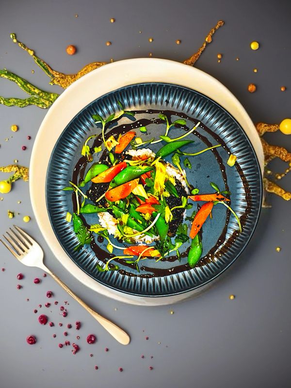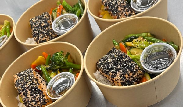 Black Sesame Seed Crusted Halibut, Carrot and Sugar Snap Salad, Jasmine Rice and Citrus Soy Sauce