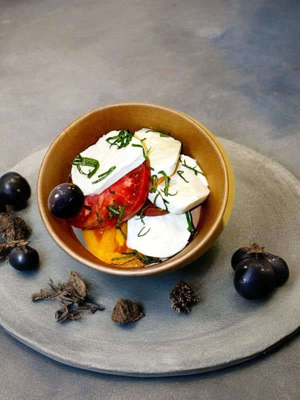 Pan seared chicken, spicy black beans, roasted salsa, tahini vinaigrette, crispy prosciutto and chili life asparagus