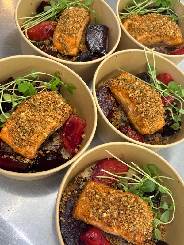 Pan seared Salmon, Grilled Cauliflower, Maple sweet Potatoes and a Cilantro Vinaigrette