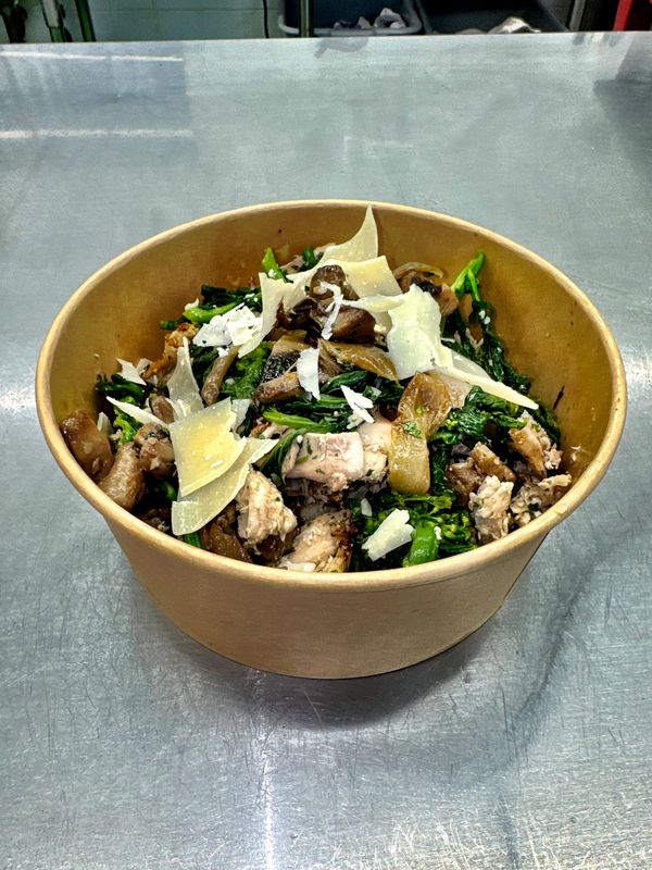 Pan Seared Chicken, Mushroom Gravy, Rice Pilaf, Garlic Broccolini