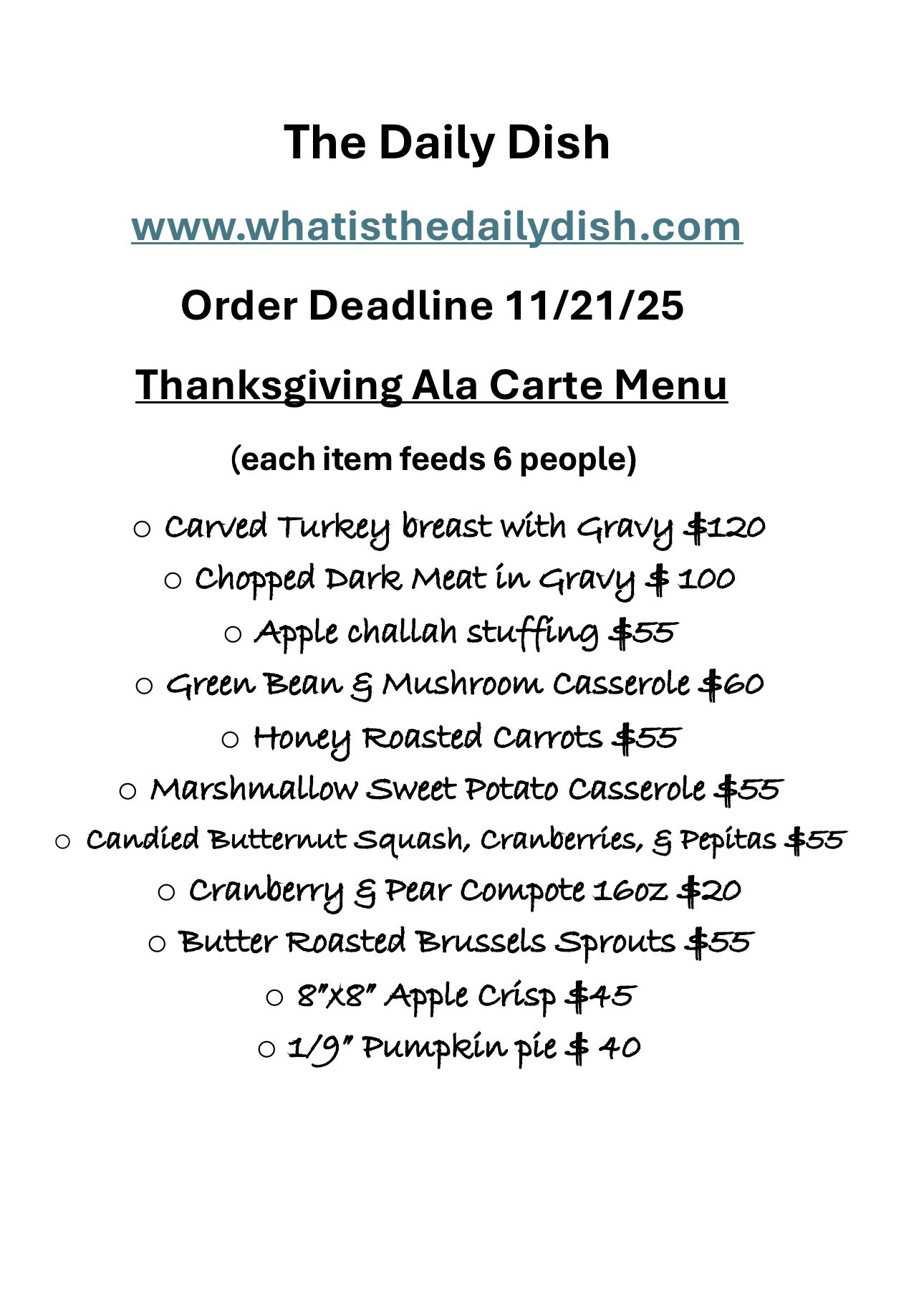Please order by Friday at 11/21/25 by 6:00pm. All  orders will be delivered on Wednesday 11/26/25